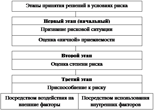 Выработана определенная тактика поведения при принятии рискованных решений. Суть ее сводится к тому, чтобы выбрать наиболее верную линию поведения, т.е. такой образ действий, который приводил бы к успеху. Отмечается некоторая специфика принятия решений в условиях риска. В частности, на начальном этапе, если ситуация признается рискованной, тщательно оценивается возможность принятия эффективного решения для конкретного случая; на втором этапе производится оценка степени риска; третий этап характеризуется конкретными действиями в сложившихся условиях (приспособление к риску), которые могут охватывать как внутреннюю, так и внешнюю сферы деятельности фирмы (рис. 2).