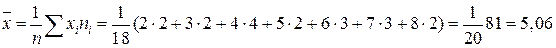 Итак, медиана данного распределения равна 5, наибольшую частоту имеет значение 4, среднее значение данного распределения 5,06, т.е. среднее значение почти совпадает с модой.