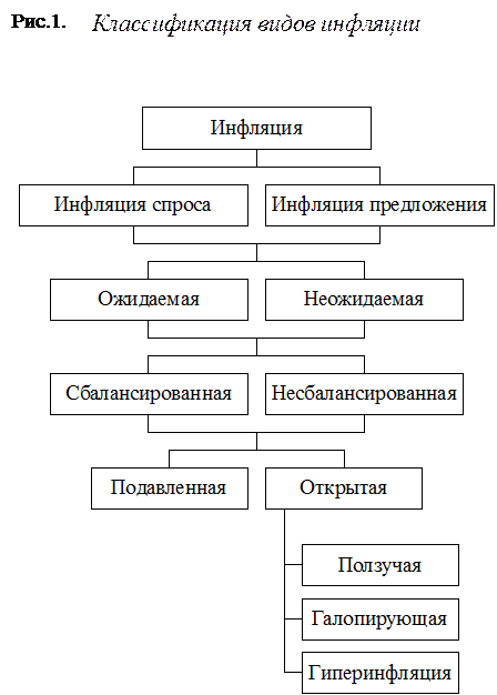 Существует несколько видов инфляции (см. рис.1).[2] Прежде всего, те, которые выделяют с позиции темпа роста цен (первый критерий). В теории и практике различают несколько т.н. «уровней» инфляции. Остановимся на рассмотрении наиболее часто возникающих и действующих в экономике уровнях инфляции.
