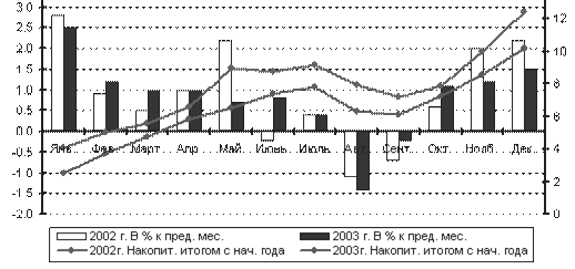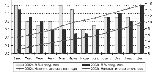 На рис. 3 представлены темпы роста цен на продовольственные товары в 2002 г. и 2003 г.[9] (Примечание: кривым на графике соответствует правая ось, столбцам – левая).