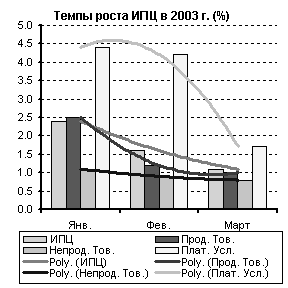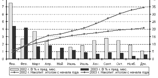 Непродовольственные товары в 2003 г. также дорожали более умеренными темпами, нежели в 2002 г. Динамика представлена на рис. 4. [10] (Примечание: кривым на графике соответствует правая ось, столбцам – левая).