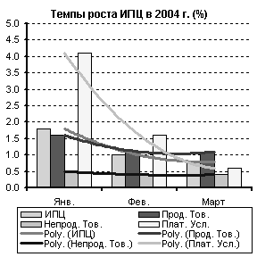 На протяжении I квартала 2004 г. наблюдалось весьма заметное снижение темпов роста потребительских цен. Несмотря на то, что в январе цены на платные услуги населению увеличивались темпами, сопоставимыми с январем 2003 г., более умеренная динамика, прежде всего, цен на продовольственные товары обеспечила снижение общего уровня ИПЦ в январе на 0,6 процентных пункта. Февральские показатели также были достаточно позитивными, особенно с учетом цен на платные услуги населению, темпы роста которых, снизились на 2,5 процентных пункта. В феврале 2003 г. столь значительного снижения не наблюдалось. Снижение темпов роста цен (на 1 процентный пункт) в категории платных услуг продолжилось и в марте 2004 г., результатом чего стало сокращение темпов роста ИПЦ на 0,2 процентного пункта. Вместе с тем, одним из негативных сигналов в марте 2004 г. явилось прекращение падения темпов роста цен на продовольственные и непродовольственные товары, как это было в предыдущие несколько лет. На представленных выше графиках об этом говорит более горизонтальный наклон линий тренда как по продовольственным и непродовольственным товарам, так и по ИПЦ в целом.