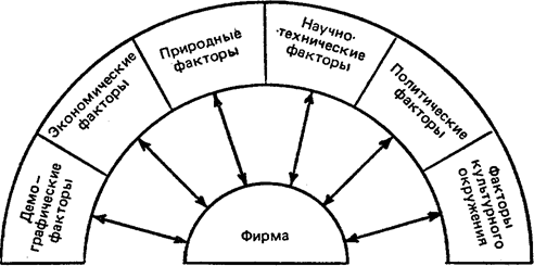 Среда организации состоит из сфер, в которых фирма должна искать для себя новые возможности и следить за возникновением потенциальных угроз. Она включает в себя все силы, сказывающиеся на способности фирмы устанавливать и поддерживать контакты с целевым рынком. Среда фирмы слагается из внешней в внутренней среды организации, то есть микросреды и макросреды.