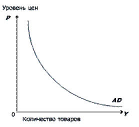 Кривая совокупного спроса AD показывает количество товаров и услуг, которое потребители готовы приобрести при каждом возможном уровне цен. Она дает такие комбинации объема выпуска и общего уровня цен в экономике, при которых товарный и денежный рынки находятся в равновесии. Движение вдоль кривой AD отражает изменение совокупного спроса в зависимости от динамики общего уровня цен. Наиболее простое выражение этой зависимости можно получить из уравнения количественной теории денег: MV=PQ,