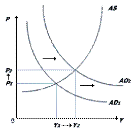 Политика государства, направленная на увеличение совокупного спроса называется политикой экспансии. Центральный банк может нейтрализовать спад в экономике, увеличив предложение денег, но последствием этого станет фиксация цен на более высоком уровне. А рост уровня цен влечет за собой инфляцию спроса. Аналогичный результат достигается увеличением расходов государства. Однако, политика экспансии обладает удивительным свойством, которое получило название «эффект мультипликатора»: общий рост национального дохода в итоге превышает государственные расходы. В свою очередь, опережающий рост национального дохода означает ускоренное расширение производства и рост занятости.