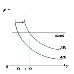 В краткосрочном периоде рост совокупного спроса приходит к увеличению выпуска и увеличению занятости, не оказывая влияния на уровень цен (рис. 3). Такое воздействие оказала в период кризиса 30-х годов государственная политика стимулирования совокупного спроса. Но если состояние экономики близко к состоянию полной занятости в долгосрочном периоде рост совокупного спроса вызовет не увеличение выпуска, так как возможности уже на пределе, а отразится на уровне цен, т.е. вызовет инфляцию (рис. 4).