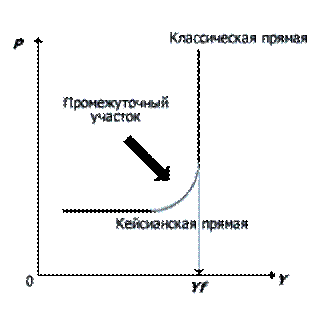 Горизонтальный, или кейнсианский, отрезок отражает совокупное предложение в краткосрочном периоде. Кейнс, именем, которого назван участок, дал следующее объяснение горизонтального характера этого участка. Он рассмотрел экономику в период спада, т. е. когда имеются в наличии зрительные запасы факторов производства, поэтому в краткосрочном периоде возможно увеличение реального национального производства без повышения уровня цен за счет привлечения дополнительного количества безработных и других факторов производства.