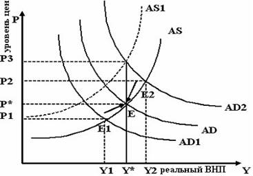 Перемещение кривой спроса увеличивает уровень цен и ВВП. На рис.8 представлены три варианта возможного макроэкономического равновесия. Равновесный уровень ВВП (y) – это такой уровень, при котором объем произведенной продукции равен совокупному спросу на нее. Точка E1 – это равновесие при неполной занятости без повышения уровня цен, т.е. без инфляции. Точка E2 – это равновесие при небольшом повышении цен и состоянии, близком к полной занятости. Точка E3 – это равновесие в условиях полной занятости (y), но с инфляцией.