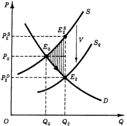 Продавец получает за каждую единицу товара меньше, чем до введения налога, и к тому же сокращается объем продаж; часть продавцов, возможно, вынуждена будет покинуть данный рынок. Сокращение их излишка представлено на рис. 1 площадью фигуры Суммарному сокращению излишков покупателей и продавцов соответствует площадь фигуры PS1PD1E1E0ES1.