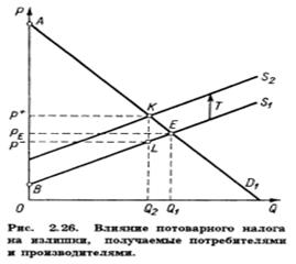 В результате введения налога излишек потребителей сократился с площади треугольника АРEЕ до площади треугольника АР+К. Излишек производителей сократился с площади треугольника ВРEЕ до площади треугольника ВР-L. Правда, часть этих потерь компенсируется поступлениями в госбюджет потоварного налога в сумме, равной площади прямоугольника Р+КLР-. Эти деньги в принципе могут быть использованы государством в интересах тех же потребителей и производителей. Тем не менее часть потерь, равная площади треугольника KLE, не компенсируется ничем. Она представляет собой чистые потери для общества от введения потоварного налога. Эти потери вызваны сокращением объема производства данного товара и перераспределением высвобожденных ресурсов в другие отрасли, где они используются с меньшим эффектом.