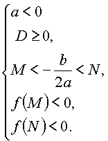 Утверждение 5. Для того чтобы только больший корень квадратного трехчлена лежал в интервале [M,N] (M < N), необходимо и достаточно: