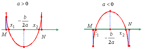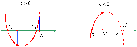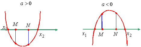 Утверждение 7. Для того чтобы один из корней квадратного трехчлена был меньше, чем M, а другой больше, чем N (M < N), т.е. отрезок [M, N] целиком лежал внутри интервала между корнями, необходимо и достаточно: