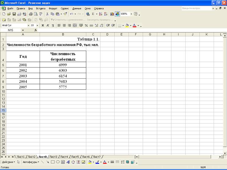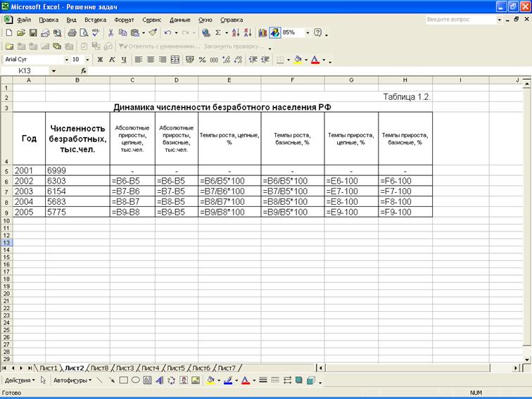 Расположение на рабочем листе Excel исходных данных (табл.1.1), расчётных формул (в формате Excel) представлено в табл. 1.2 и результаты расчётов приведены в табл. 1.3. На рис.1 представлено графическое изображение динамики численности безработного населения.