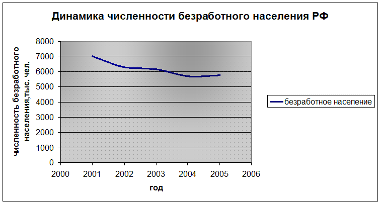 Исходя из полученных результатов, можно сделать вывод, что в период 2001-2005 гг. в РФ наблюдалось снижение уровня численности безработного населения.