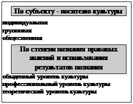 Выделение структурных элементов правовой культуры достаточно условно, так как нет правовой деятельности, осуществляемой отдельно от правового сознания, а правосознание может проявиться лишь в правовой деятельности и ее результатах — правовых актах. Наконец, все составные части правовой культуры не могут существовать без своего носителя-субъекта — человека, группы людей, населения в целом. Правовая культура общества зависит от уровня правового развития различных социальных (классов, например) и профессиональных групп, а также от уровня развития отдельных индивидов. В этом аспекте нужно выделять правовую культуру населения в целом, групповую правовую культуру и правовую культуру личности, человека. В последнем случае также надо учитывать уровень правовых знаний данного индивида и отношение его к правовой ценности, к закону, уровень правовой установки на соблюдение юридических предписаний.