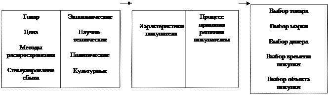 Важным шагом в моделировании поведения конечного потребителя на рынке является этап принятия решения о покупке. Покупка — это всегда компромисс, ожидаемый риск. Одним из методических подходов в решении данной задачи служит «модель черного ящика» (рис.5). При моделировании принятия решения о покупке «черный ящик» рассматривается как набор определенных стимулов, под воздействием которых происходит принятие решения о покупке. Это стимулы внутреннего характера (физические и духовные потребности, стремление к самоутверждению, склонность к экономии) и стимулы внешнего характера (групповые интересы, обычаи, традиции).