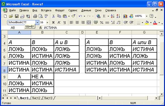 Для расчета приведенных логических функций в Microsoft Excel имеются одноименные функции.