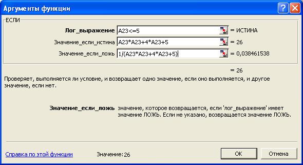 Введем в ячейку А23 значение переменной х, а в ячейке В23 выберем функцию ЕСЛИ. Для Лог_выражения функции зададим A23<=5, для Значение_если_истина введем A23*A23+4*A23+5, для Значение_если_ложь введем 1/( A23*A23+4*A23+5). В итоге форма задания аргументов функции ЕСЛИ будет иметь вид: