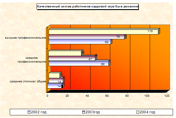 Улучшение качественного состава работников кадровой службы Общества произошло в 2004 году в связи с окончанием обучения 15 специалистами в группе ускоренной заочной подготовки в УГТУ-УПИ по специальности «Менеджмент» со специализацией «управление персоналом». Кроме этого, качественные показатели по возрасту и по уровню образования претерпели изменения в результате естественного выбытия «стажистов» и прихода на смену им молодых специалистов с высшим образованием.