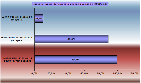 На данных диаграммах видно, что процент резервистов, назначенных на освободившиеся ключевые должности резерва, в 2004 году несколько снижен по сравнению с 2003 годом. При этом доля назначенных на эти должности руководителей и специалистов, не состоящих в резерве кадров, составляет 10,2 %. Такую эффективность подготовки резервистов можно признать удовлетворительной, так как на освободившиеся ключевые должности резерва назначаются не только подготовленные для занятия данных должностей специалисты, но и происходит приток свежих сил, что способствует внесению в производственно-хозяйственную деятельность Общества новых форм и методов работы, развитию творчества, принятию неординарных управленческих решений и т.п.