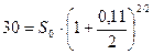 Рассчитайте величину долга, если его полная сумма через два года составит 30 млн.руб. Начисление осуществляется каждые пол года исходя из годовой ставки 11 % по схеме сложных процентов.
