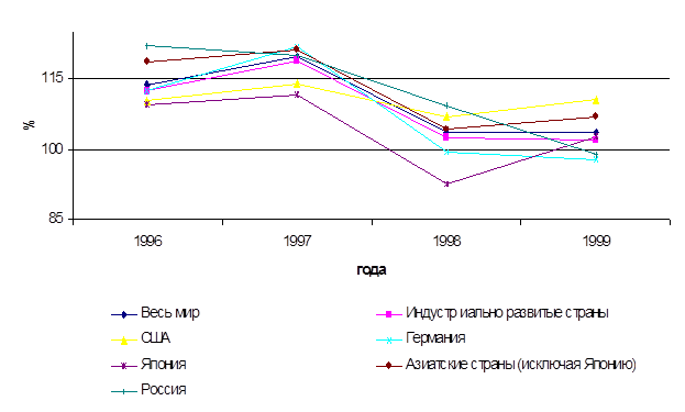 В 90-е годы после довольно умеренного роста и стагнации (в 1993 г.) объем мировой торговли с 1994 года начал расти достаточно быстро. Темп прироста мировой торговли в 1995 году составил почти 9 %. В 1996 году объем ее увеличился на 8 %, в 1997 году - на 9,5 %, что является рекордным показателем за последние 20 лет. В 1998 году, несмотря на мировой финансовый и экономический кризис, темпы роста международной торговли составили 6 %.