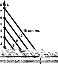 Если предприниматель имеет только 3 денежные единицы, то он может приобрести только 1 единицу капитала. Обозначим соответствующие точки на осях абсцисс и ординат и соединим их прямой. Получится изокоста (изокоста значит "равные издержки") 3 денежных единиц. Изокоста - это прямая, каждая точка которой показывает различные комбинации вовлекаемых в производство двух переменных факторов при одинаковых издержках на их приобретение. Аналогичным образом построим изокосты 6, 9, 12 и 18 денежных единиц. Получится карта изокост (рис.6)