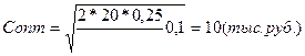 где С опт- оптимальный размер заказываемой партии, тыс. руб. К - стоимость доставки одной партии товара, тыс. руб. Q – месячный оборот склада, тыс. руб./ мес. М – стоимость хранения товара на сумму 1 тыс. рублей в течение месяца, тыс. руб./ мес. В нашем случае имеем следующие исходные данные (данные взяты из первичной документации, используемой на складе): - месячный оборот склада равен 20 тыс. руб./ мес. - стоимость хранения материала на суму в 1 тыс. руб. в течение месяца равен 0,1 тыс. руб./ мес. - стоимость одной партии материала равна 0,25 тыс. руб. При данных исходных данных, подставленных в формулу (8), получим: