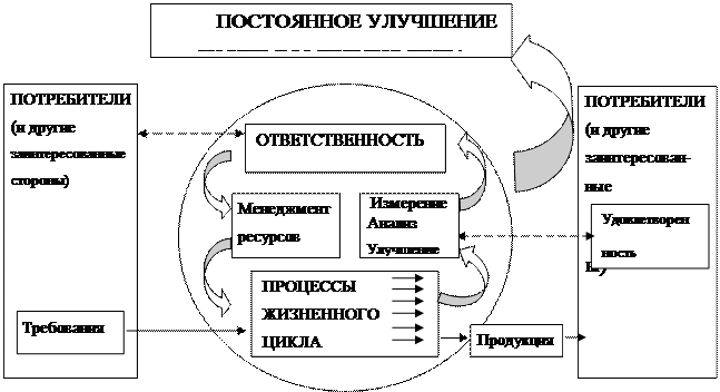 Модель Системы Менеджмента Качества (СМК), приведенная на рис1, содержит требования потребителей и удовлетворение этих требований, обеспеченные методами постоянного улучшения СМК.