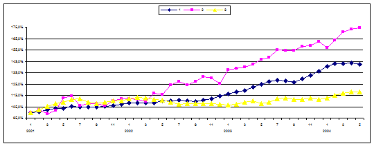 Во-вторых, при сохранении относительно высоких помесячных темпов роста ВВП в течение второго полугодия 2004 года (на уровне 0.5-0.6%) из-за эффекта «возрастающей базы» прошлого года, а также относительного ослабления внешнего спроса темп роста ВВП понизится и в целом за 2004 год оценивается в 6.6 процента.