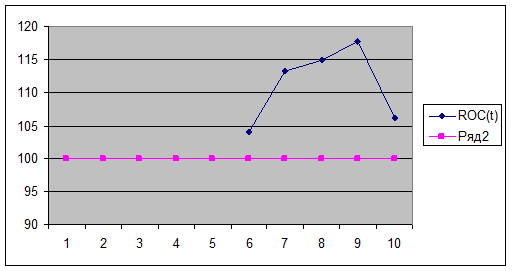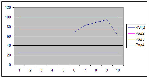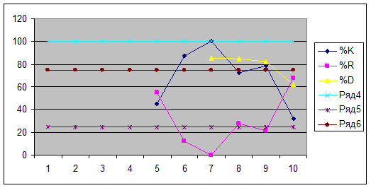 График %К показывает, что в 5-ый день можно совершать финансовые операции в соответствии с сигналами других индексов, т.к. график находиться в нейтральной зоне; 6 – 7 дни рекомендуется прекратить финансовые операции (график находиться в критической зоне «перекупленности»); 8-ой день – выход из критической зоны в нейтральную, рекомендуются продажи, ожидается разворот; выход из нейтральной зоны в критическую, рекомендуется прекратить все финансовые операции; 9-ый день – выход из критической зоны в нейтральную, рекомендуется продажи, сигнал разворота; 10-ый день – можно совершать финансовые операции в соответствии с сигналом других индексов.