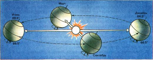 Каждые 24 часа Земля совершает 1 оборот вокруг своей оси, которая отклонена от вертикали на 23,5°. Из-за этого наклона на Земле, пока она вращается по эллиптической орбите вокруг солнца за 365 дней происходит смена времен года. Благодаря этому наклону, Земля подставляет солнцу то южное, то северное полушарие. Если наклонено северное полушарие, то там наступает лето, а в южном полушарии в это время зима. Если под воздействие солнечных лучей попадает южное полушарие, то там лето, а в северном зима. В северном полушарии лето теплее, т.к. там находится больше суши, в южном полушарии наоборот находится меньше суши, а больше воды. Морские воздушные массы охлаждаются медленнее, потому лето там длиннее.