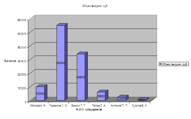Построим теперь гистограмму объема продаж по сотрудникам.