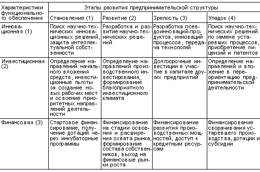 Необходимо связать элементы функционального обеспечения со стадиями развития предпринимательских структур. Направления подобной увязки можно представить нижеследующей таблицей-матрицей (табл. 1).