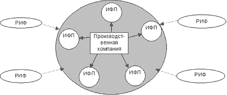 Сочетание процессов поглощения и рыночной инновационной интеграции дает основание предложить использование так называемой «веерной» организации инновационного процесса (рис. 2). Ее смысл заключается в создании инновационного окружения производственной компании, состоящего из фирм, в отношении которых совершено поглощение (ИФП), а также рыночно интегрированных фирм (РИФ).