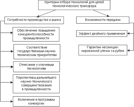Представляется важным прежде всего определить принципы передачи технологий. Они должны быть следующими: возмездность, контролируемость направлений использования, дальнейшее научно-техническое развитие, отсутствие негативных последствий для оборонных и стратегических отраслей. Критерии отбора технологий для передачи в промышленность могут быть представлены двумя группами: критериями, характеризующими потребность производства и рынка, и критериями, связанными с возможностью передачи. Состав этих групп в более детальной разбивке представлен на рис. 3.