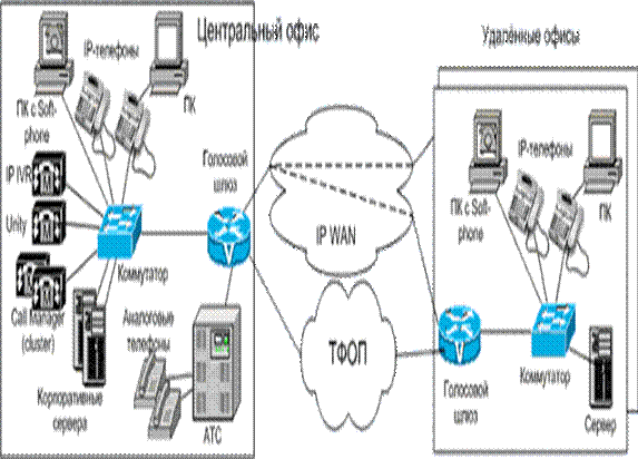 Кратко рассмотрим схему построения сети IP телефонии на базе решений ведущего производителя сетевого оборудования Cisco Systems .