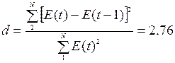 Примечание. В случае если полученное значение больше 2, значит имеет место отрицательная автокорреляция. В таком случае величину d уточняют, вычитая полученное значение из 4.