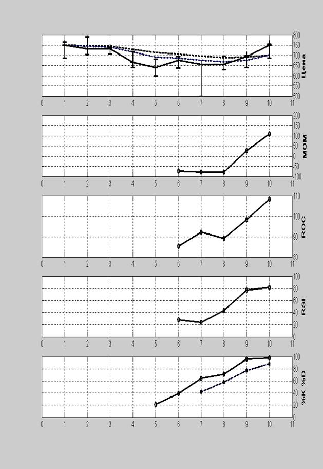 Если МОМ, ROC и RSI используют только цены закрытия, то стахостические линии строятся с использованием более полной информации. При расчете используются также максимальные и минимальные цены. Как правило, применяются следующие стахостические линии: %К, %D, медленная %D и %R.