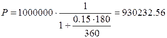 2. Через 180 дней после подписания договора должник уплатит 1 000 000 руб. Кредит выдан под 15% годовых (проценты обыкновенные). Какова первоначальная сумма и дисконт?