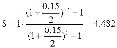 10. В течении 4 лет на расчетный счет в конце каждого года поступает по 1 000000 (1 млн.), на которые 2 раза в году (m=2) начисляются проценты по сложной годовой ставке 15%. Определить сумму на расчетном счете к концу указанного срока.
