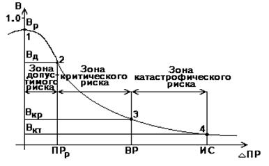 Знание показателей риска - Вр, Вд, Вкр, Вкт - позволяет выработать суждение и принять решение об осуществлении предпринимательства. Но для такого решения недостаточно оценить значения показателей (вероятностей) допустимого, критического и катастрофического риска. Надо еще установить или принять предельные величины этих показателей, выше которых они не должны подниматься, чтобы не попасть в зону чрезмерного, неприемлемого риска.