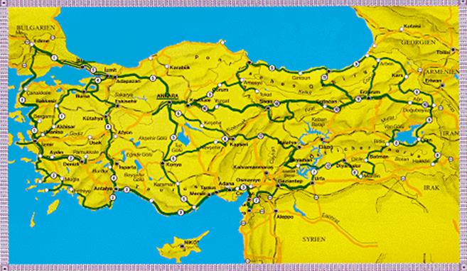 Турция - это государство в Юго-Восточной Европе и Юго-Западной Азии. На северо-западе граничит с Болгарией и Грецией, на северо-востоке - с Грузией и Арменией, на востоке - с Ираном, на юге - с Ираком и Сирией. На севере омывается Черным морем, на северо-западе - Мраморным морем, на юге - Средиземным морем, на западе - Эгейским морем. Площадь страны 779452 км2. Азиатская часть Турции носит название Анатолия, европейская же часть составляет всего около 3% территории[2]. Страну можно условно разделить на семь физико-географических регионов: Фракия и побережье Мраморного моря; регион Эгейского и Средиземного морей; Черноморский регион; западная Анатолия; Анатолийское плоскогорье; восточное нагорье; юго-восточная Анатолия.