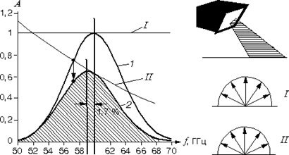На длине волны l = 1.25 см (частота 24,125ГГц) и q = 45° шероховатость должна быть не менее 2 мм. Это условие хорошо выполняется на пути со щебеночным балластом. В этом случае основание может быть представлено в виде излучателя Ламберта, где отраженная энергия пропорциональна косинусу угла падения. В диапазоне обычно используемых углов раскрытия антенны амплитуду можно считать практически независимой от направления распространения. В этом случае говорят об изотропном отражении. Несколько иная картина на пути с гладким бетонным основанием. Когда шероховатость поверхности приближается к предельной, характеристика направленности становится более выраженной, а амплитуда отраженного излучения явно зависимой от угла падения. Эта зависимость может быть описана в виде функции основания U(q) или U(v). В случае изотропного отражения из геометрии лепестка направленности антенны получают спектр I. При отражении, зависящем от угла, действительна функция UII, при умножении которой на составляющие спектра I получается спектр II. Еще сложнее ситуация на пути с металлическими шпалами, имеющими скошенные стенки. В этом случае функция основания имеет ярко выраженный максимум.