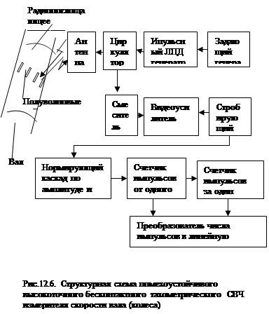 Структурная схема высокоточного бесконтактного тахометрического СВЧ измерителя скорости вала (колеса) приведена на рис.12.6. Помехоустойчивость в данной схеме достигается большой мощностью излучения, значительным загрублением чувствительности, введением операции стробирования, внесение частотно-избирательного подсчета числа импульсов пакете.