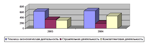 На рис. 6 отображена динамика среднесписочной численности работников в организации в 2004 году по сравнению с 2003 годом по направлениям деятельности компании: