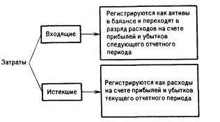 Для определения себестоимости произведенной продукции и полученной прибыли необходимо различать входящие затраты, и истекшие затраты. Входящие затраты — это средства, ресурсы, которые были приобретены, имеются в наличии и, как ожидается, должны принести доходы в будущем. В балансе они регистрируются как активы. Если эти средства (ресурсы) были израсходованы для получения доходов и потеряли способность приносить доход в дальнейшем, то они переходят в разряд истекших, что отражается на счете прибылей и убытков. Например, затраты на производство товаров для перепродажи, если эти товары не реализованы и хранятся на складах, регистрируются в балансе как входящие. Если же данные товары проданы, то эти входящие затраты должны быть отнесены к истекшим, что отражается в смете затрат, понесенных в результате реализации товаров. Их следует сравнивать с доходами от продажи для того, чтобы определить прибыль. Следовательно, затраты — это средства, израсходованные на получение доходов. Разница между истекшими и входящими затратами проиллюстрирована на рис. 1.