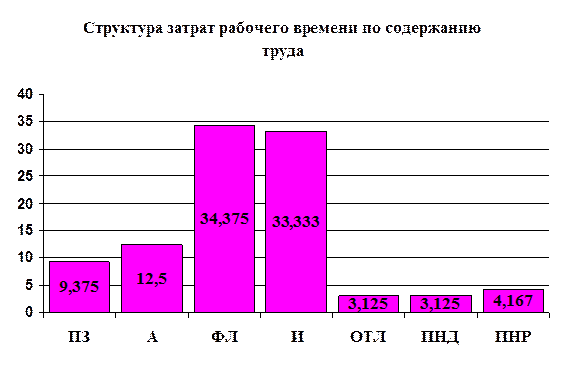Анализируя структуру затрат рабочего времени, следует заключить, что наибольшую долю в структуре затрат занимает время формально-логической работы (34,375%) и время технической (исполнительской) работы (33,333%). Следует признать эти показатели удовлетворительными, с той оговоркой, что организационными мерами следует снижать перерывы в работе, связанные с нарушением трудовой дисциплины и недостатками в организации производства.