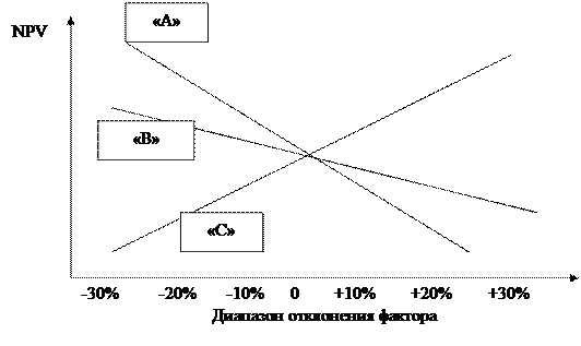 Большее влияние на результативность оказывает проект «А», так как с увеличением NPV уменьшается диапазон отклонения фактора.