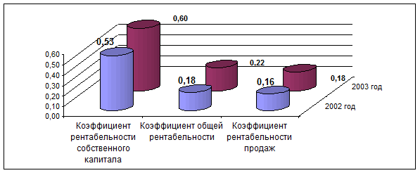 Таким образом, на основании проведенного анализа коэффициентов рентабельности ООО «Крузарус» (Табл. 2), можно сделать вывод о высокой рентабельности анализируемой организации. При небольшом росте коэффициента рентабельности продаж в 2003 году (0,2) коэффициент общей рентабельности вырос на 0,05 пункта (Рис. 5).